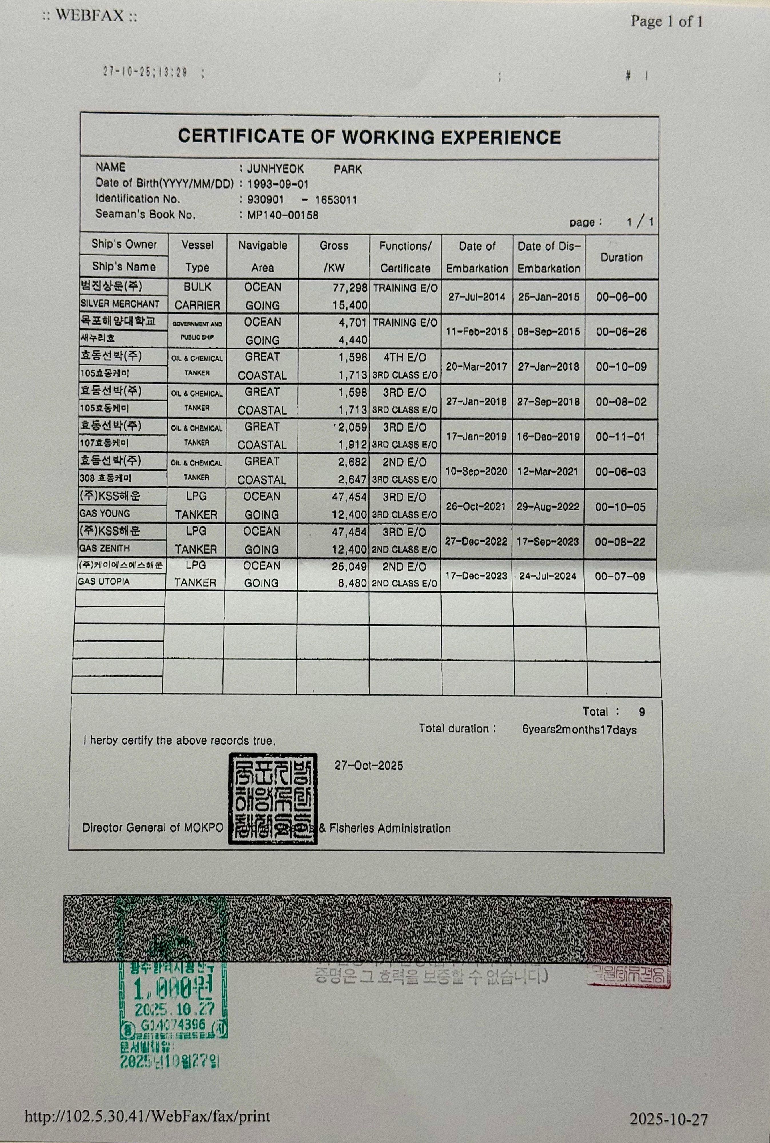 국문 승무경력증명서 업로드