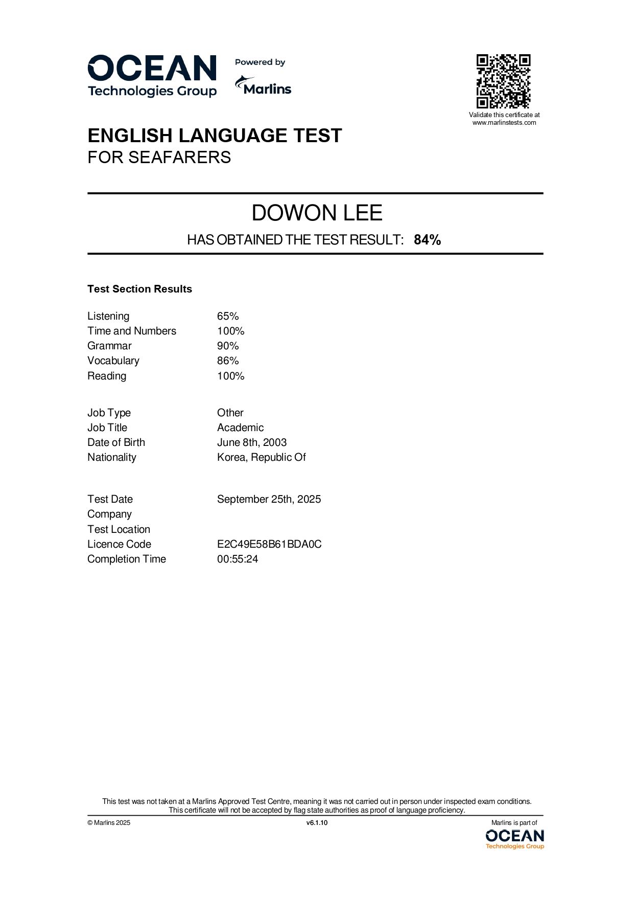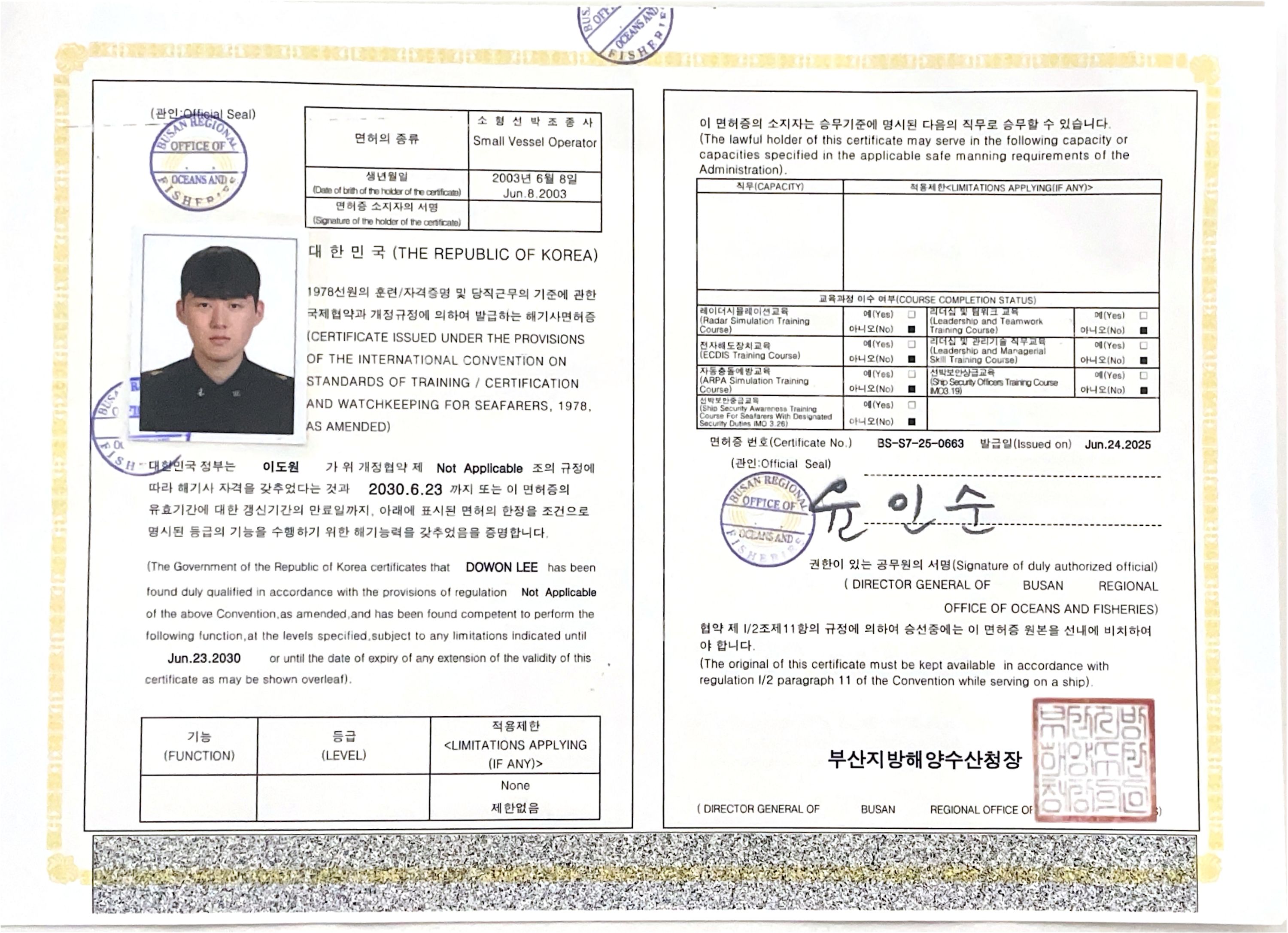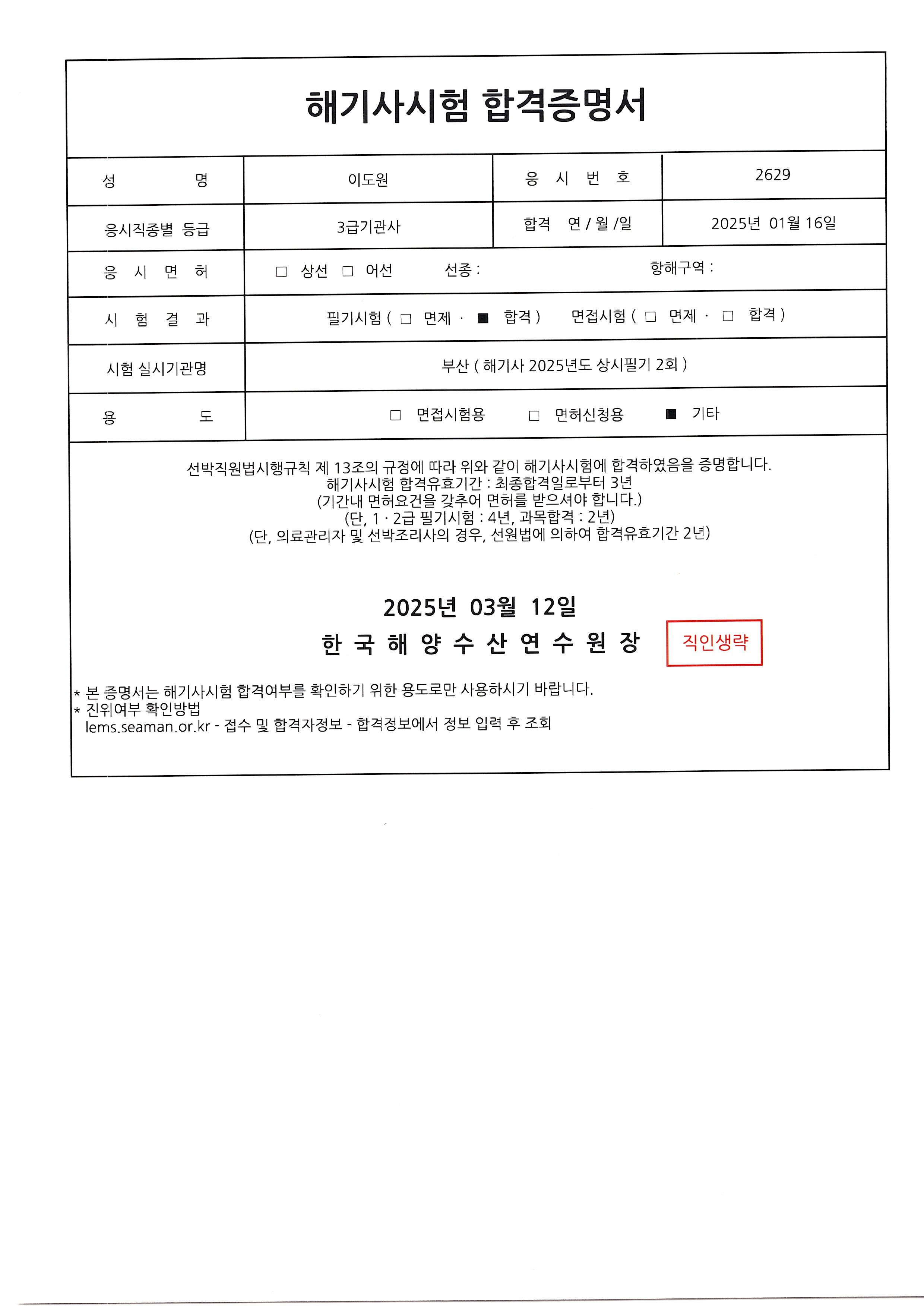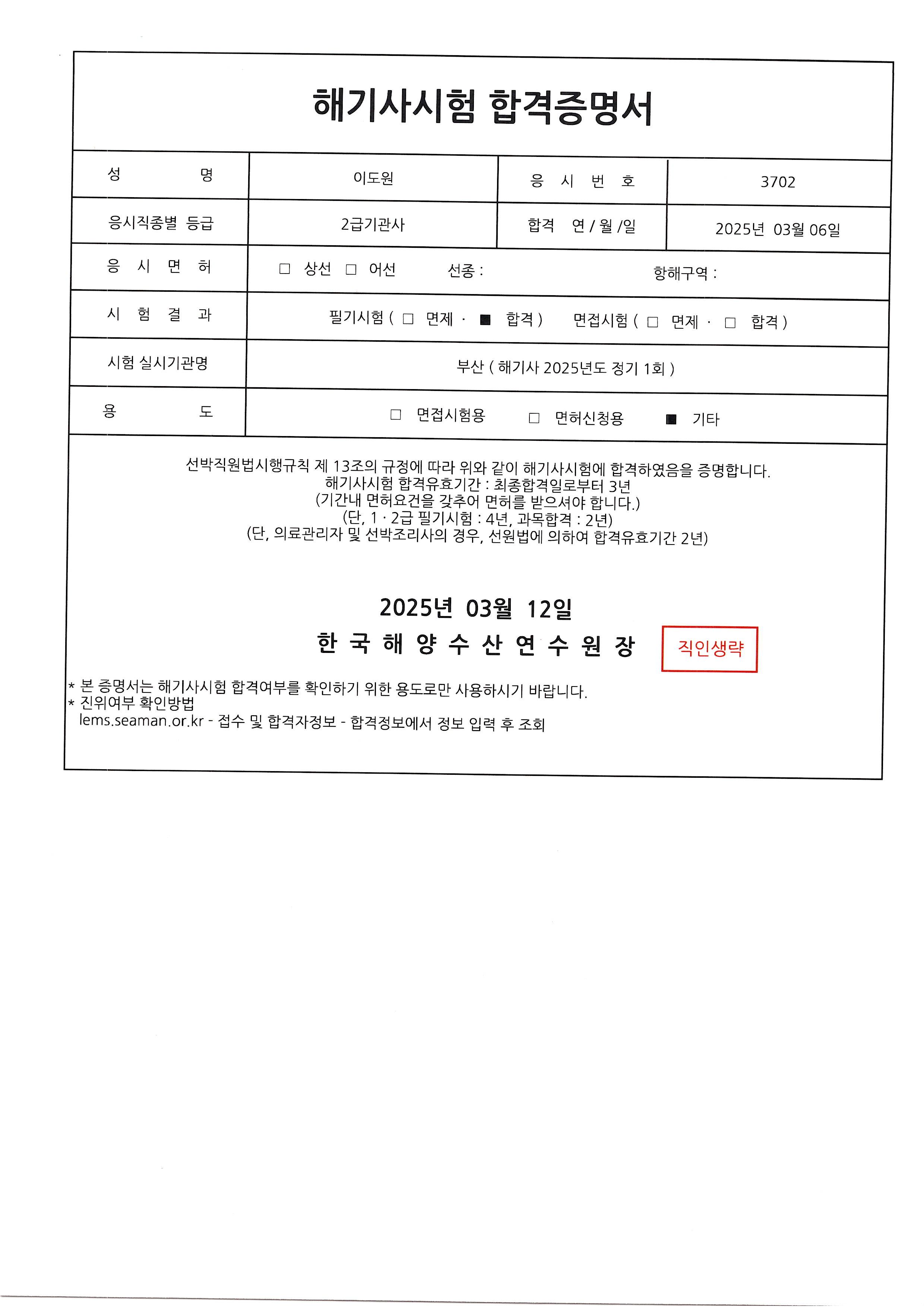 3급 해기 면허 합격 및 취득 완료2급 면허 필기 합격